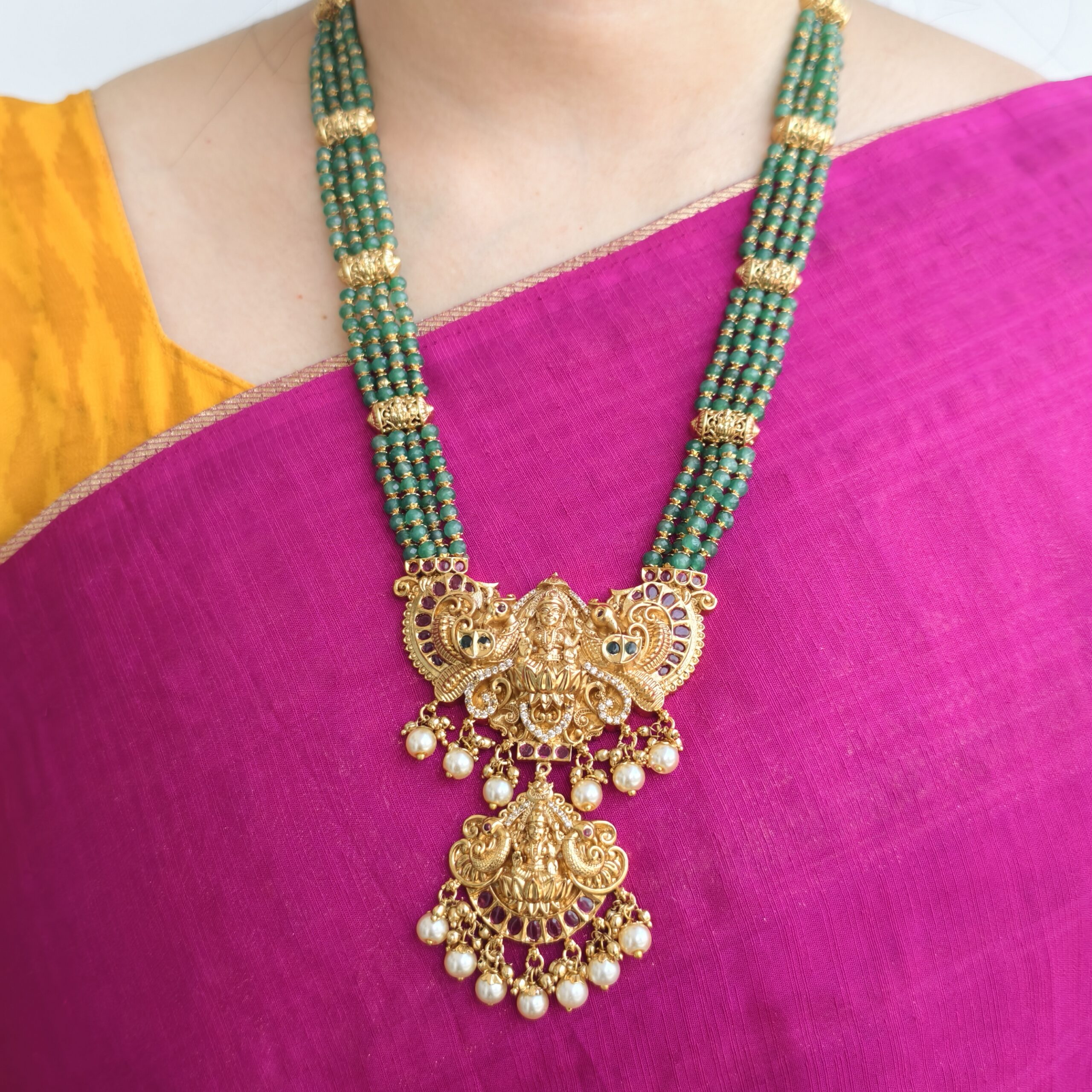 HomeLONG HARAM SETSfj2349 lakshmi pendant raniharam with green onyx beads and matching earrings