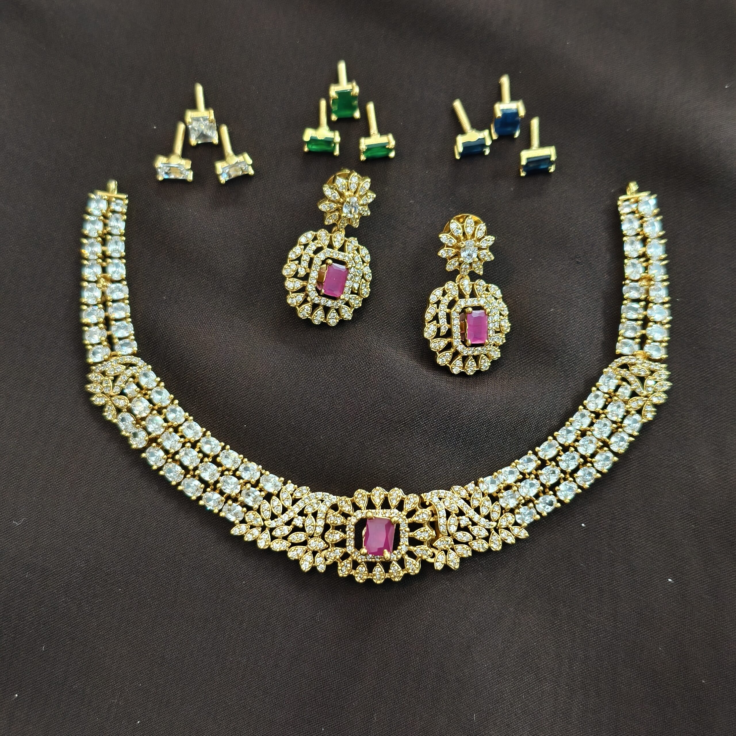 White stone changeable stone choker with earrings and backchain