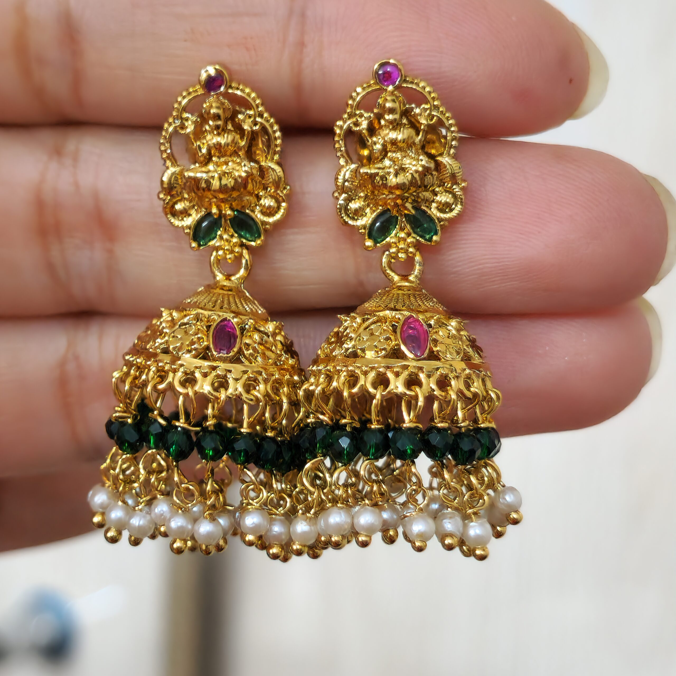 lakshmi jhumkas with green and pearl