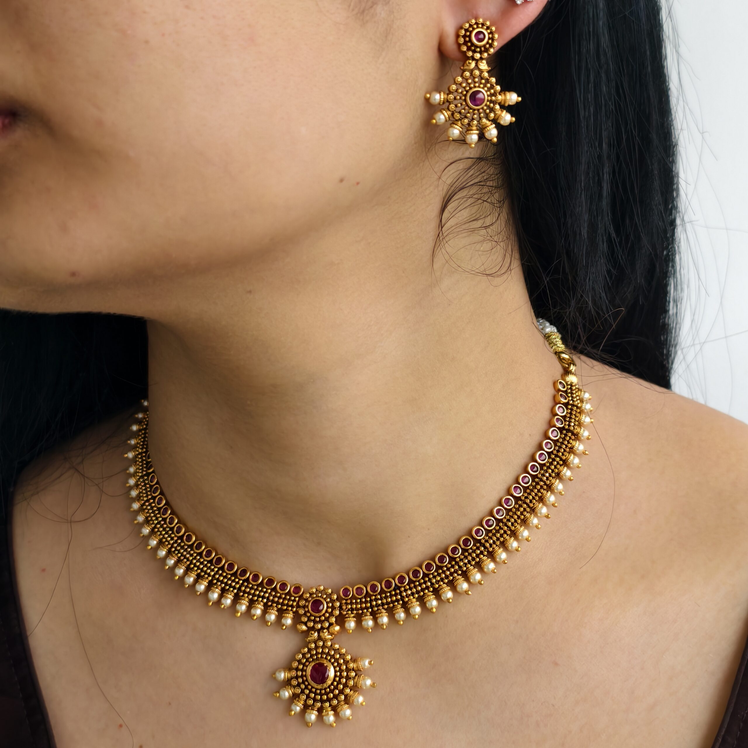 fj1904 gold look alike traditional pota rubystone neckset pushback earrings