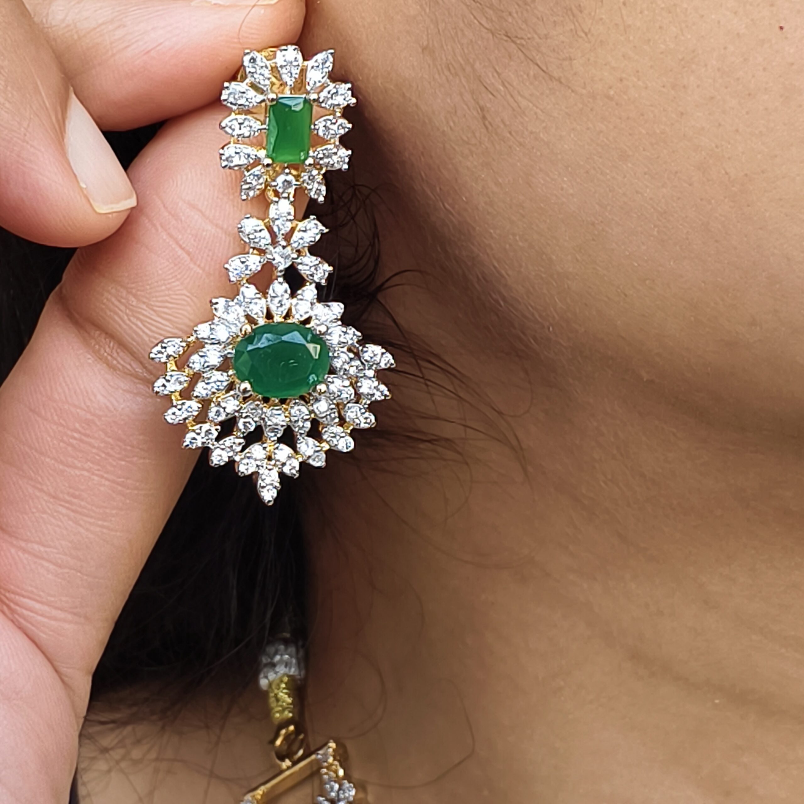 Be the first to review “fj2044 diamond replica two step gree stone neck set with bombay screw back ear rings”