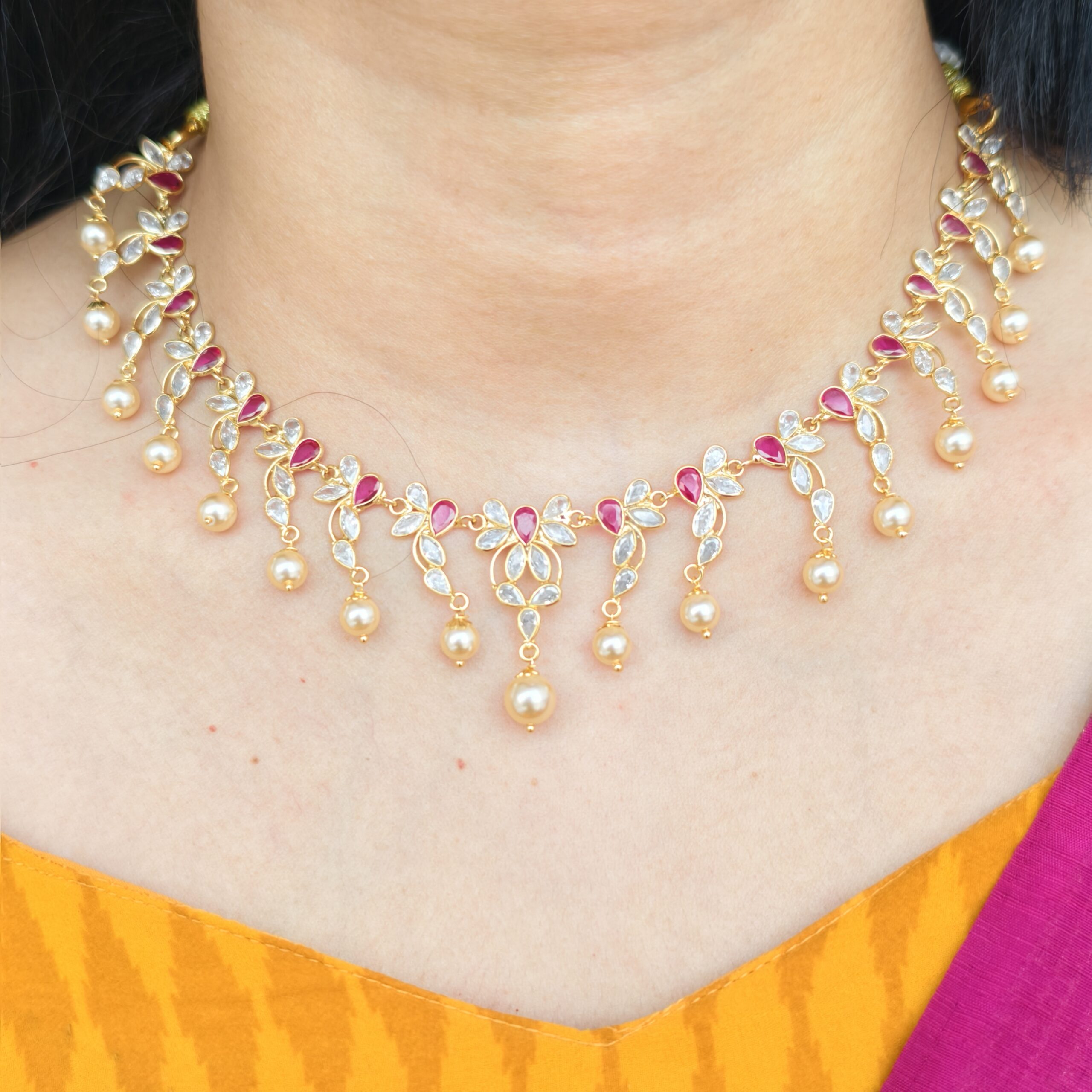 2 reviews for fj2173 real gold look lotus polki rubystone with swarovski pearl neckset with screwback earrings