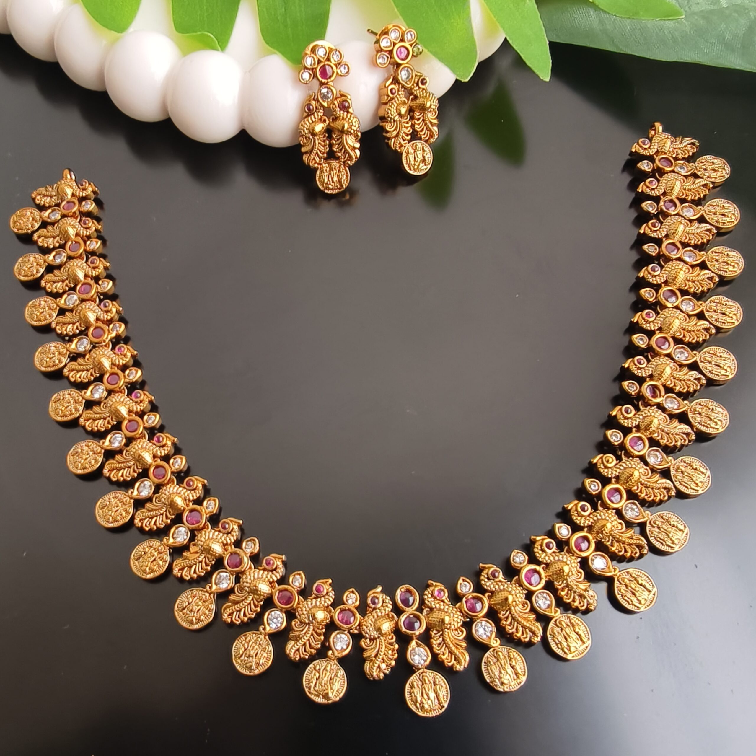 Be the first to review “fj2234 ruby stone ramparivar kasu design neckset with pushback earrings”