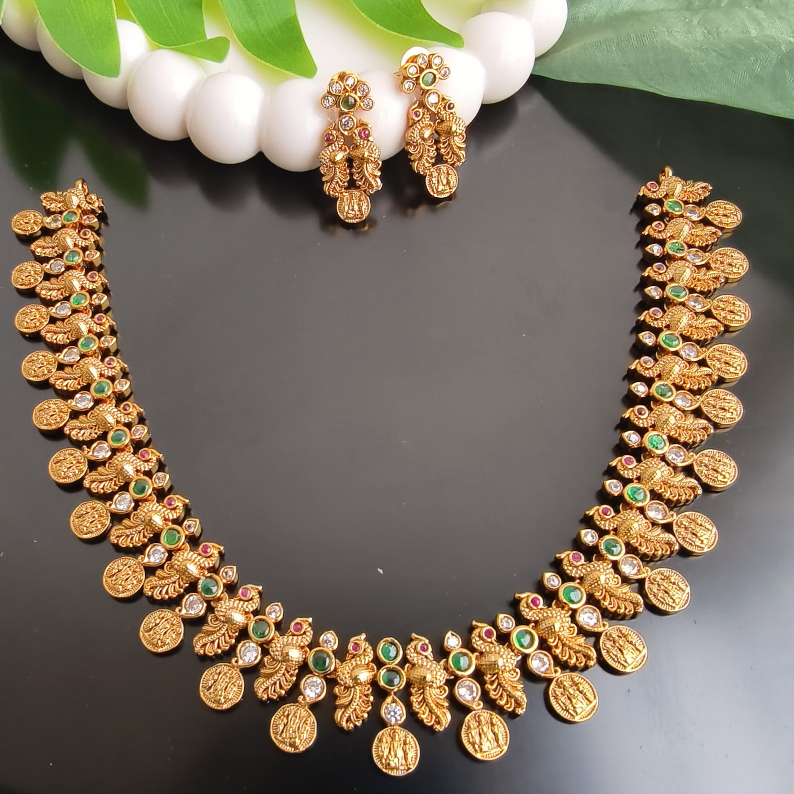 fj2235 green stone ramparivar kasu neckset with pushback earrings