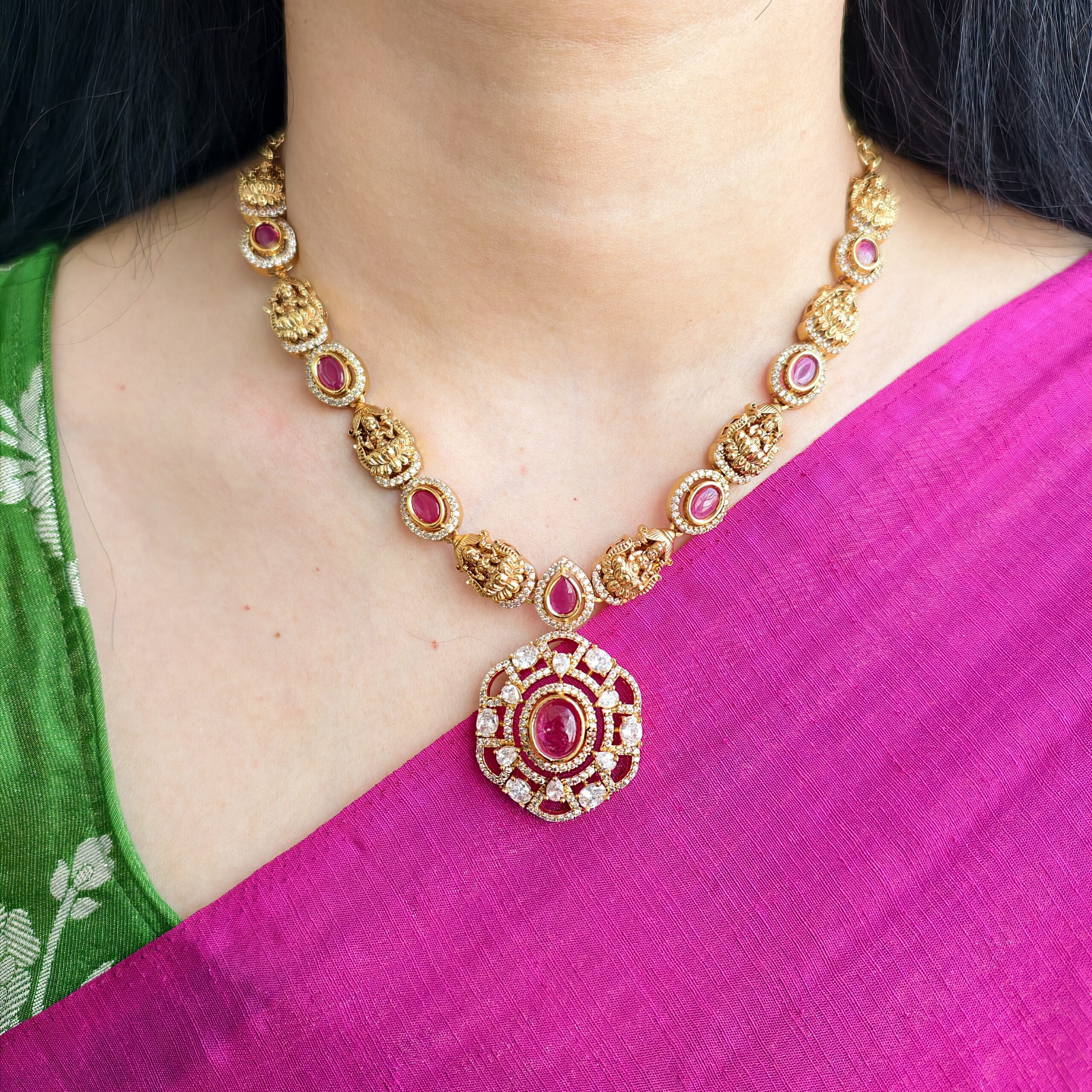 fj2246 high premium quality lakshmi with pota ruby stone neckset with screwback earrings and backchain
