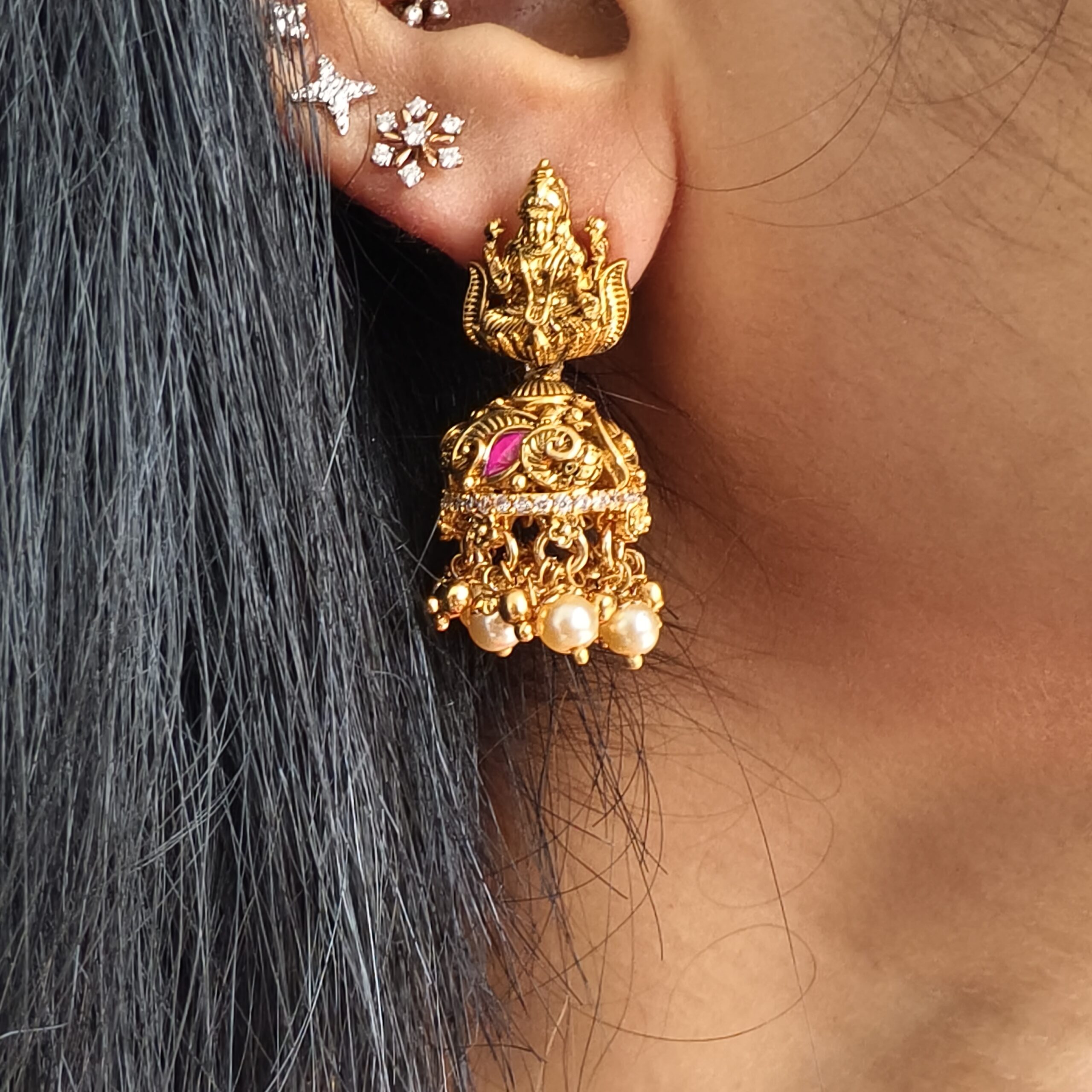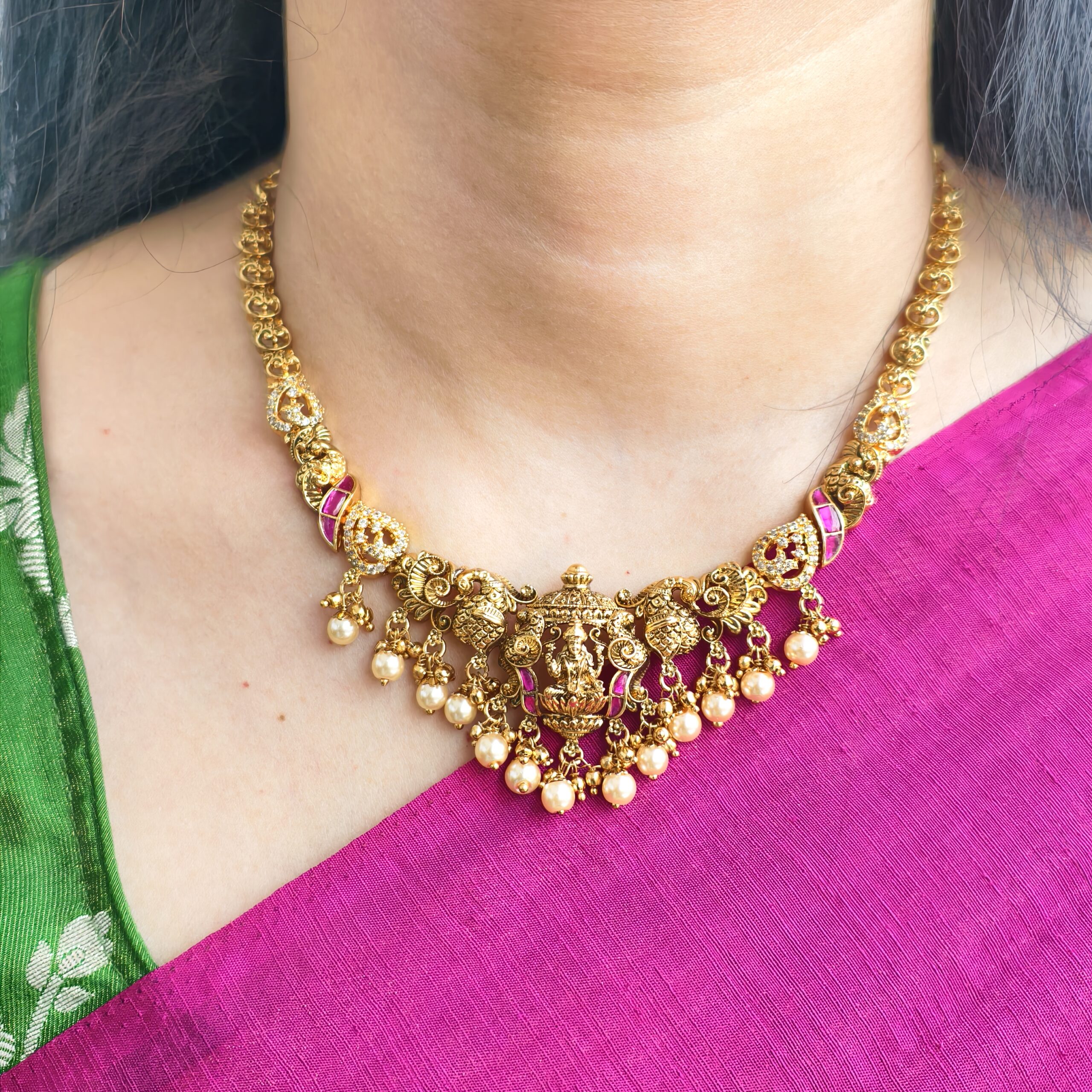 HomeNECK WEARnecklacesfj2251 real gold look alike jadav kundan lakshmi neckset with chain and pushback jhumkas