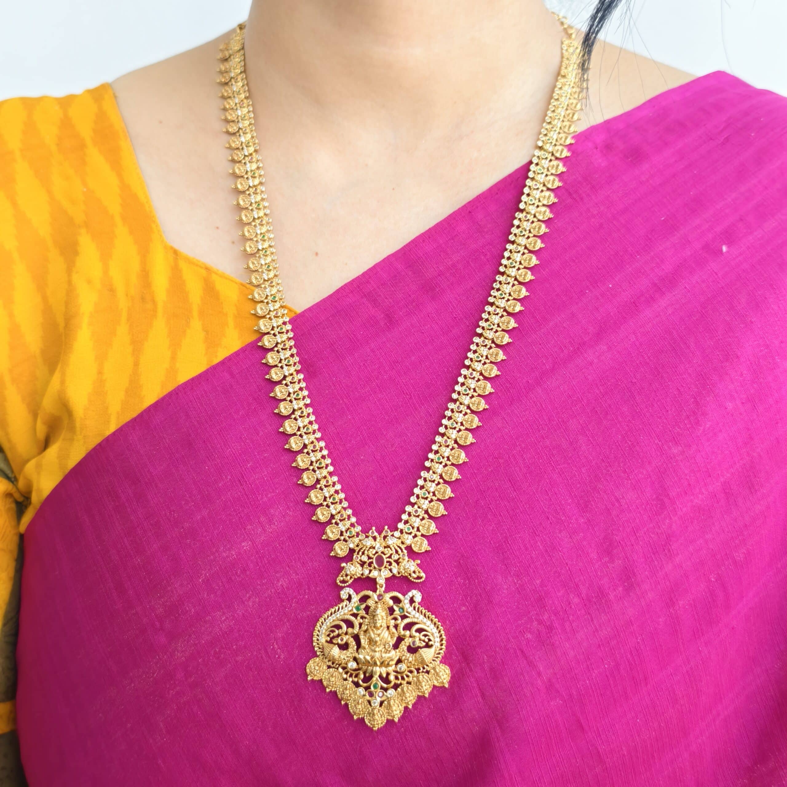 HomeLONG HARAM SETSfj2337 gold replica lakshmi long haram with screw back earrings and backchain