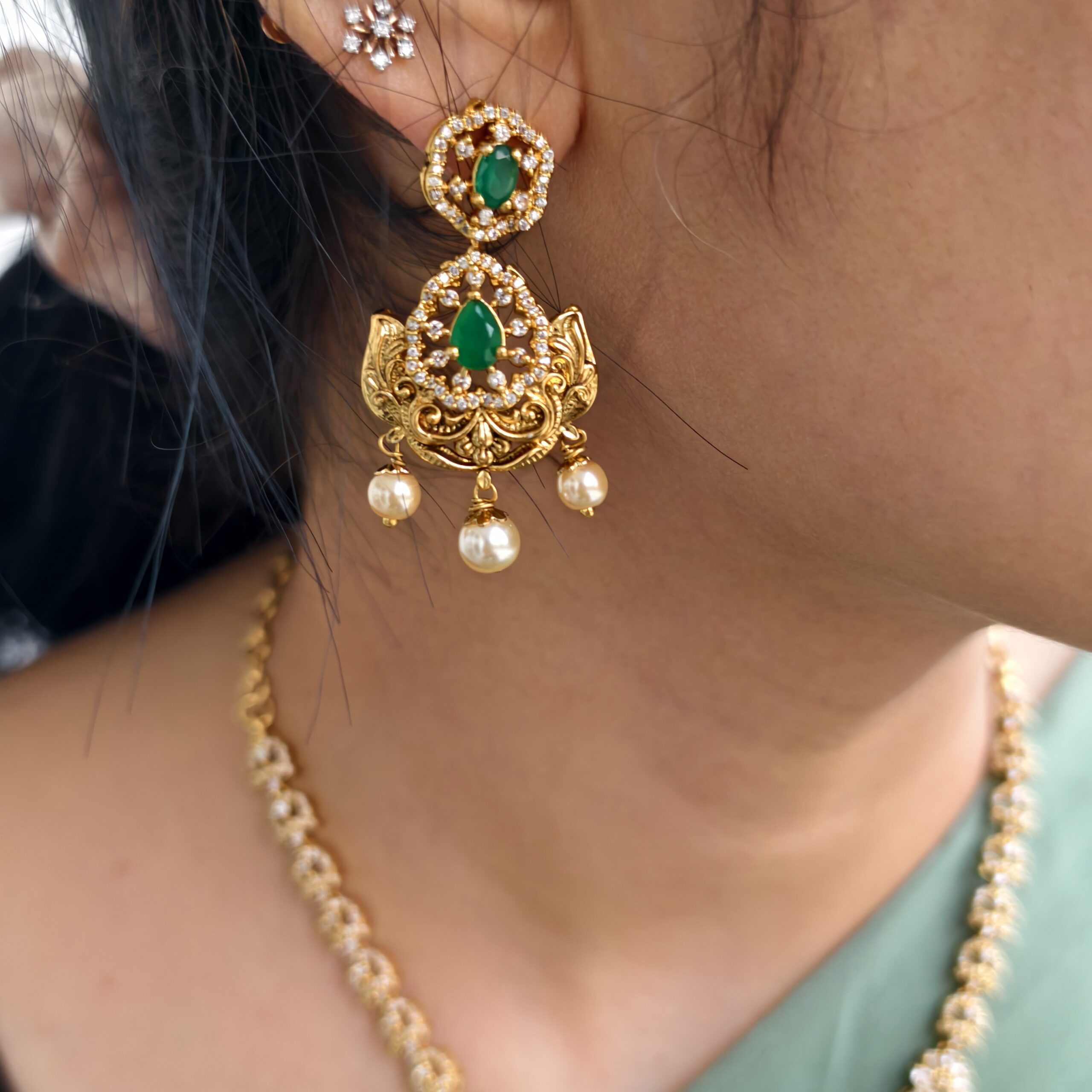 Be the first to review “fj2403 gold look alike green stone designer neckset with pushback earrings and back chain”