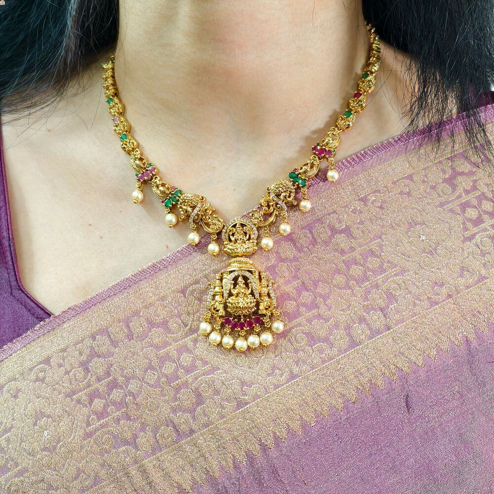 HomeNECK WEARnecklacesfj2588 real gold look alike lakshmi dollar peacock necksetwith screwback earrings and backchain