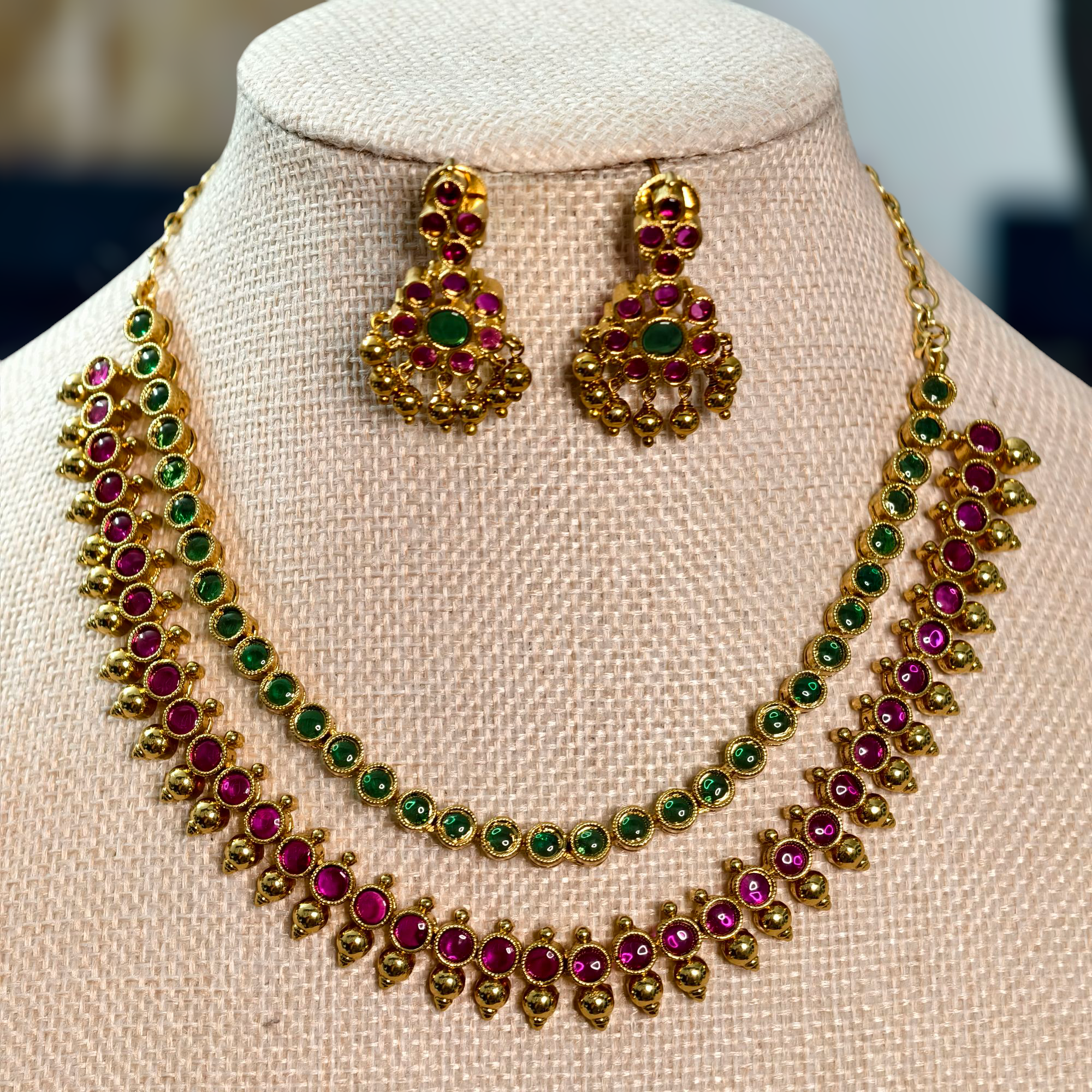 Traditional design pota ruby and emerald stone neckset with back chain and earrings
