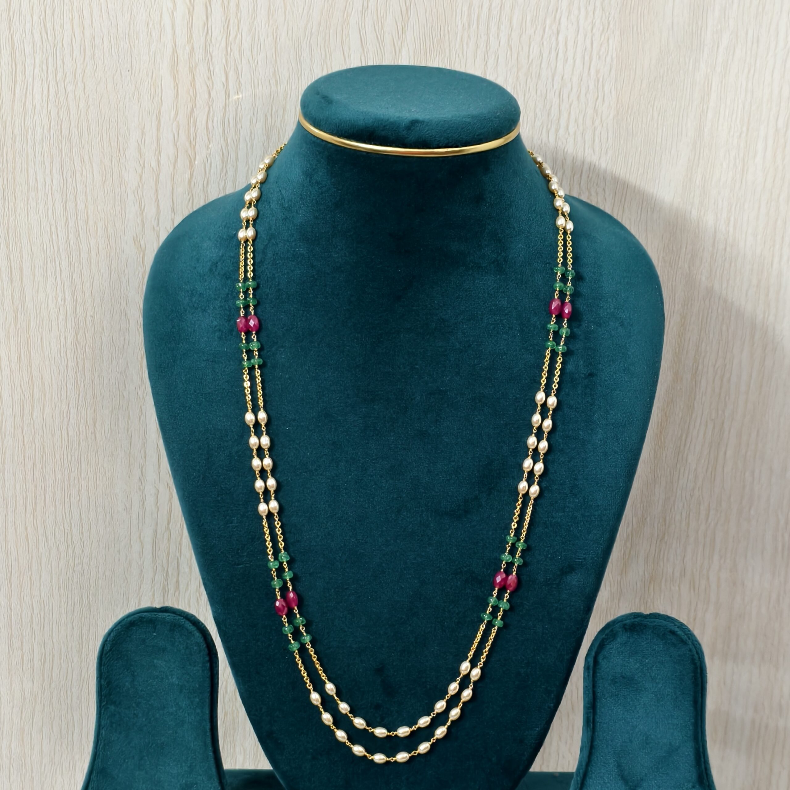 fj1655 rice pearls with chetan ruby and green pumpkins kattu theega chain 24inch
