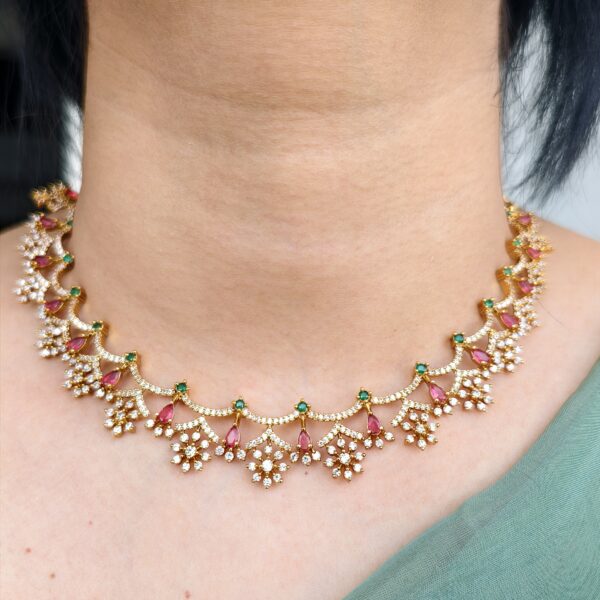 fj1848 RUBY WITH GREEN FLOWER NECKSET WITH PUSHBACK EARRINGS AND CHAIN