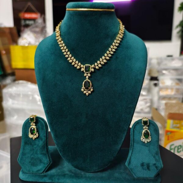 fj2622 real gold look white and green stone neckset with screwback with backchain