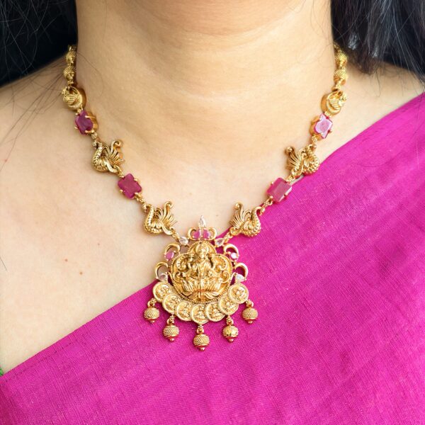 fj2289 gold look alike ruby stone lakshmi pendant neckset with pusback earrings
