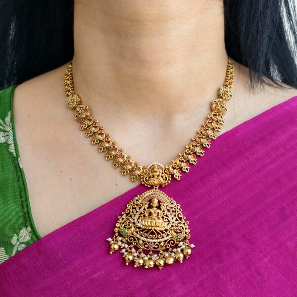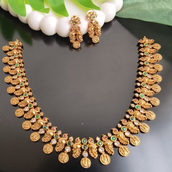 fj2214 real gold look nakshi finish lakshmi necset with screwback earrings and backchain
