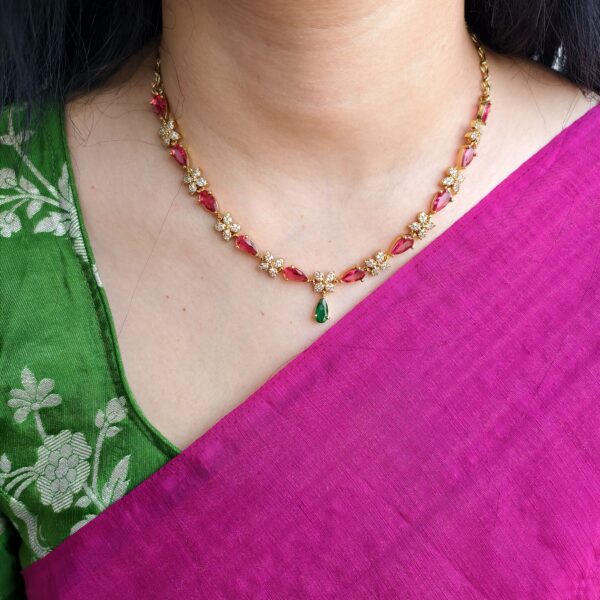 fj2247 ad glass pink stone and green stone simple neckset with screwback earrings and backchain
