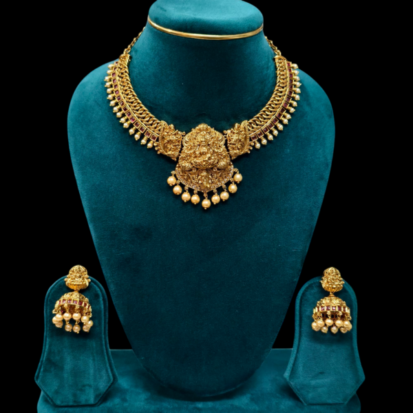 fj2036 antique finish lakshmi glass ruby stone neckset with backchain and screwback earrings