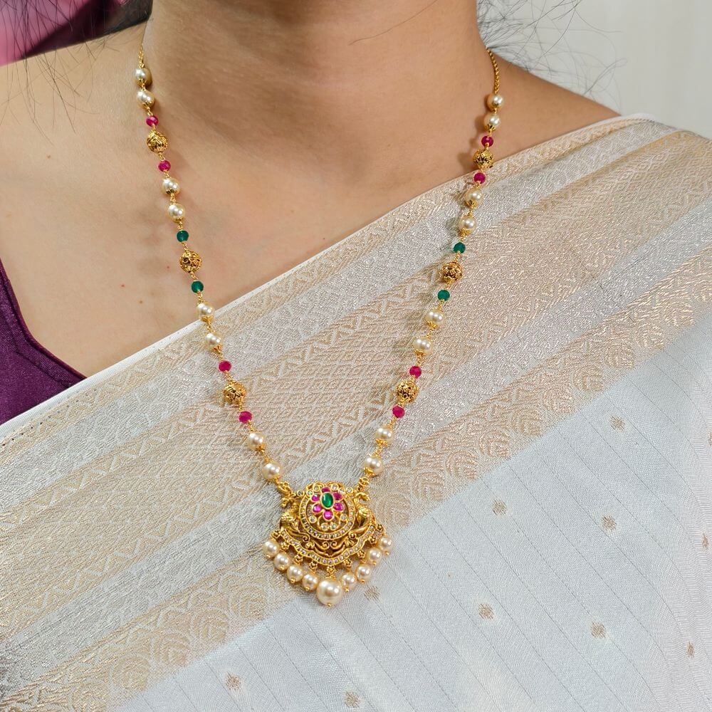 fj2535 jadav stone peacock pendant with swarovski chetam rubi and green kattutheega chain 21inch