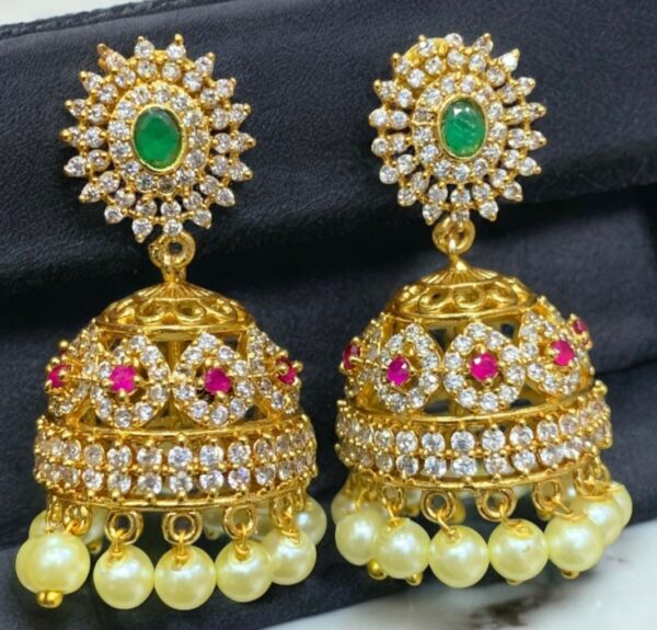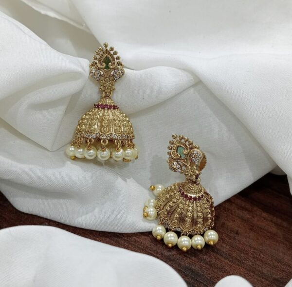 Premium matt gold multi stone jhumka with pearl hangings