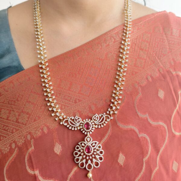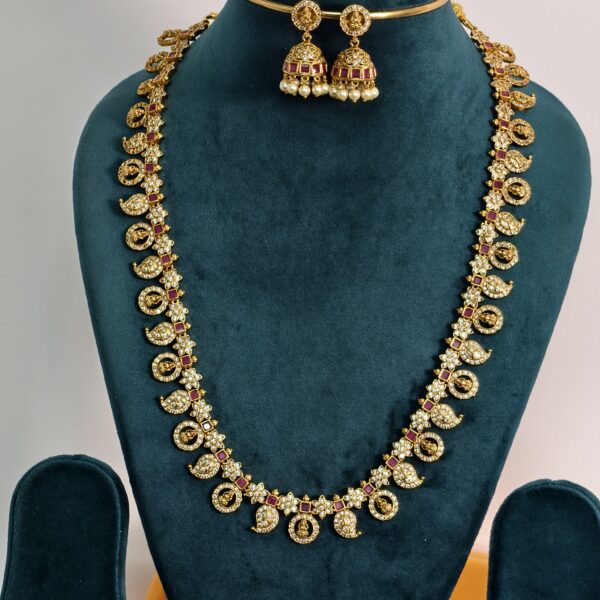 lakshmi mango ruby and white mid length haram with jhumkas