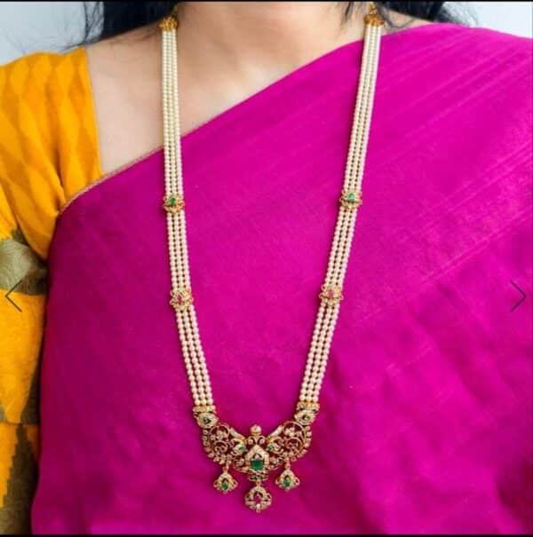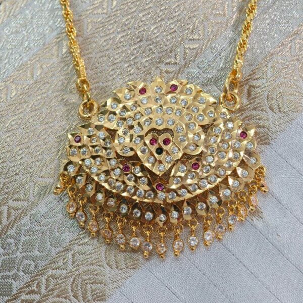 fj2535 jadav stone peacock pendant with swarovski chetam rubi and green kattutheega chain 21inch